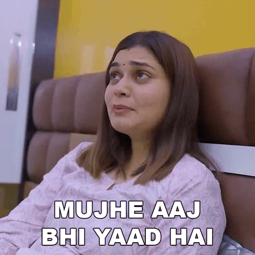 Nancy sits in a chair with the Hindi text 'Mujhe Aaj Bhi Yaad Hai' (I still remember today) overlaid on the screen.