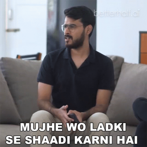 A man on a couch expresses his strong desire to marry a specific girl, referencing the Betterhalf.ai platform.