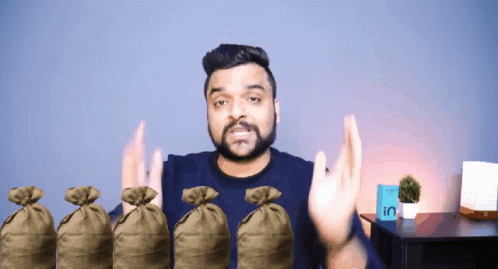 Mukul Stufflistings, a tech influencer, stands in front of a row of money bags, gesturing towards them.