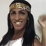 Mulher Pepita smiles and changes expressions, wearing a leopard print headband and large earrings.