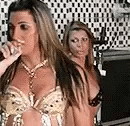 Mulher Pepita sings into a microphone while another woman watches, performing in a sparkly costume.
