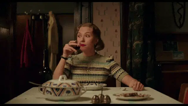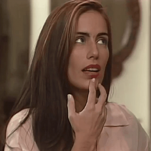 Glória Pires as Raquel from Mulheres De Areia, deep in thought, finger to lips, looking upwards.