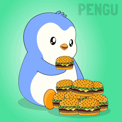 a penguin is eating a bunch of hamburgers with the word pengu behind it