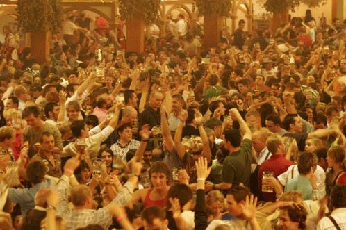 A massive crowd at Munich's Oktoberfest, cheering and raising their beer steins in a festive hall.