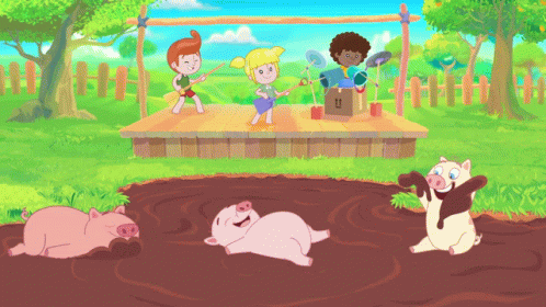 Animated characters Dan, Lila, and Tito play music while pigs enjoy a muddy puddle in Mundo Bita.