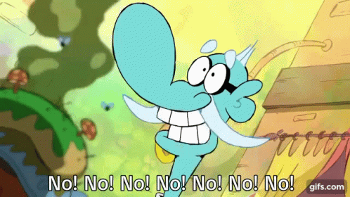 Mung Chowder, the blue elephant-like character, emphatically shouts 'No!' multiple times with a wide-open mouth.
