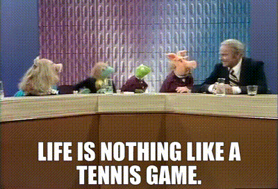 Miss Piggy, Kermit, and other Muppets sit at a table, with a caption stating, 'Life is nothing like a tennis game.'