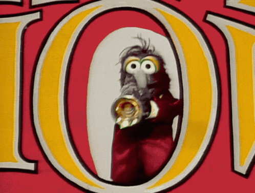 Gonzo Muppet plays a trumpet, emitting green smoke, within the iconic Muppet Show title card.