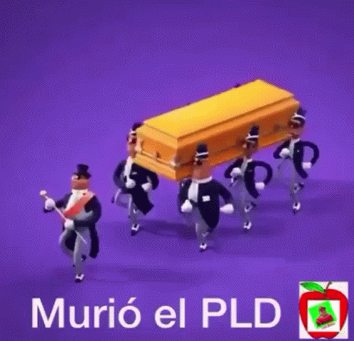 Animated Coffin Dance meme featuring pallbearers carrying a yellow coffin with 'Murió el PLD' text.