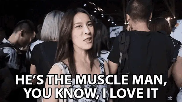 a very muscular woman is standing in a gym with her hands behind her head