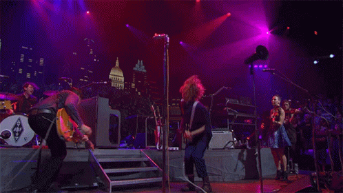 Arcade Fire, featuring Sarah Neufeld, performs live on stage with vibrant lighting.
