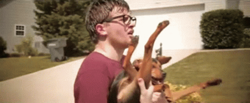 Jarrod Alonge in a comedy music video, holding a dog upside down.