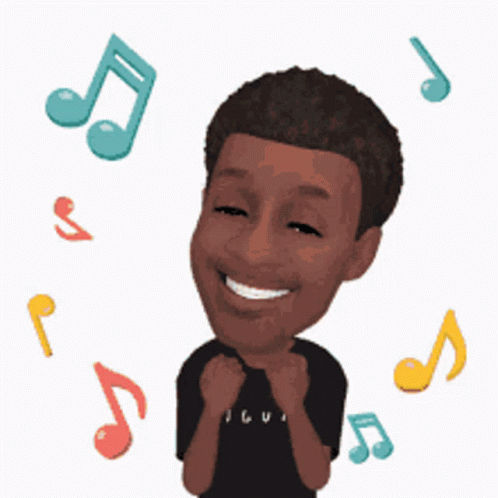 Animated character with dark skin and curly hair, smiling with musical notes floating around him.