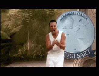 Mustafa Sandal energetically dancing in a white tank top, with a Turkish sign in the background.