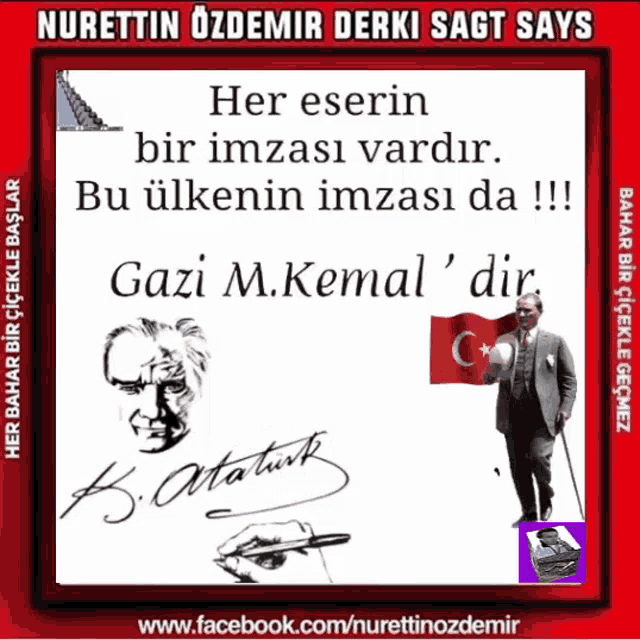 A poster featuring Mustafa Kemal Atatürk and a quote by Nurettin Ozdemir about the nation's signature.