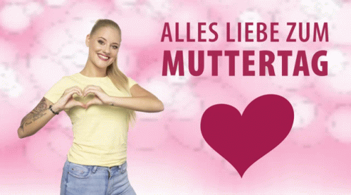 A woman makes a heart shape with her hands, celebrating Mother's Day with the message 'Alles Liebe zum Muttertag'.