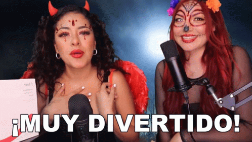 Merith Aranda and a friend in Halloween costumes, sitting with microphones, sharing a very fun moment.