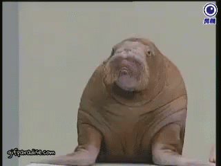 A walrus sitting upright, looking thoughtful and rubbing its chin, with the Spanish caption 'Muy Interesante' (Very Interesting).