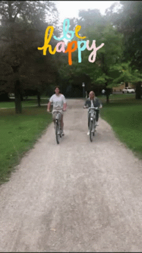 Two friends joyfully cycling Mvg Rad bikes in a park, with a 'Be Happy' message overlay.