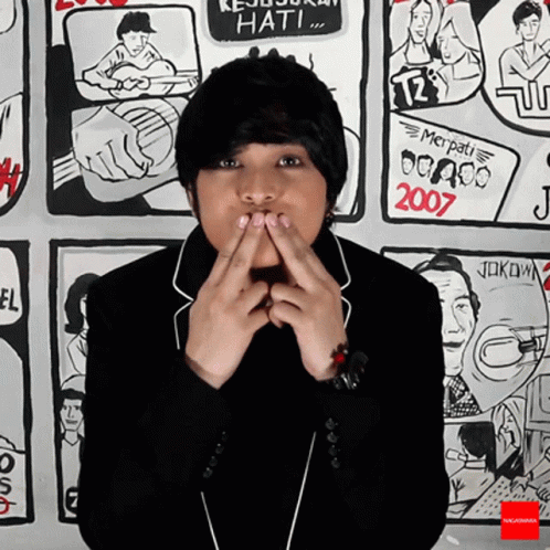 Mita The Virgin blows affectionate kisses to the camera, standing before a wall of unique drawings.