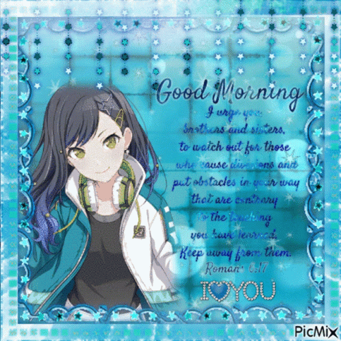 An Shiraishi from Project Sekai with a "Good Morning" message and a Bible verse from Romans 16:17.