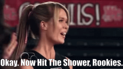 Stephanie from My Babysitters A Vampire, played by Leah Cludmore, tells cheerleaders to 'Hit The Shower, Rookies.'