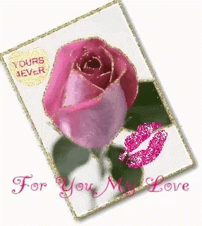 A sparkling pink rose on a card with 'YOURS 4EVER' and 'For You My Love' text, featuring a glittery kiss.