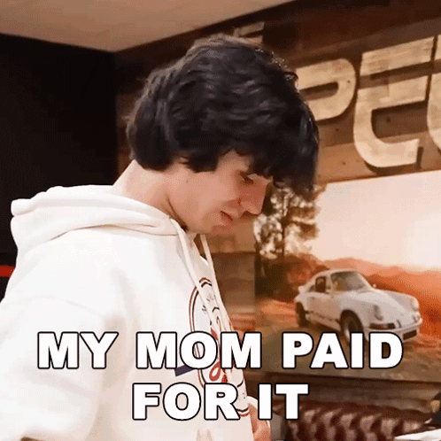Lofe says "My Mom Paid For It" in front of a Porsche sign, implying a luxurious purchase.
