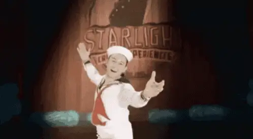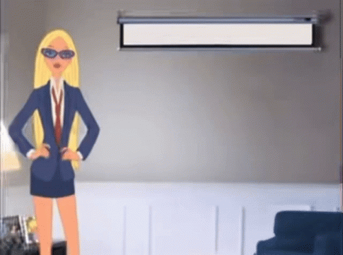 My Scene character in a suit and sunglasses gives a presentation in a room with a projector screen.