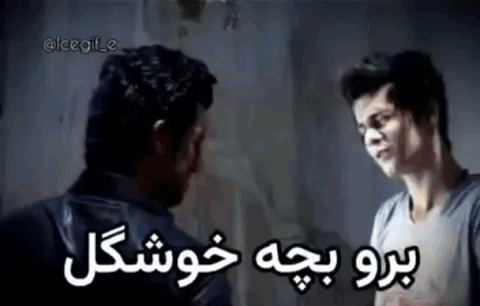 Two men interact in a street scene with Persian text 'Go, pretty boy' overlaid, creating a meme.