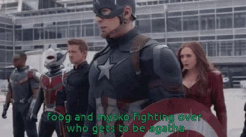 Mysko and Foog are seen fighting over who gets to portray Agatha Harkness, set against a scene with Marvel's Avengers.