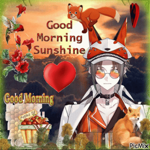 Mysta Rias in a vibrant 'Good Morning Sunshine' graphic with foxes, hummingbirds, and flowers.
