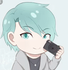 Chibi Jihyun Kim from Mystic Messenger holding a camera, smiling and taking a picture.