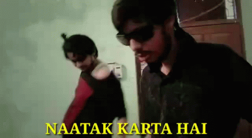 A man in sunglasses dramatically acts while another man stands in the background, captioned 'Naatak Karta Hai'.