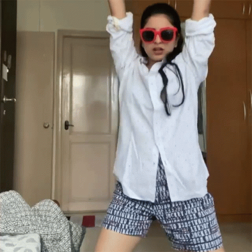 Siddhi Mahajankatti shows off her energetic dance moves in a white shirt and patterned shorts.