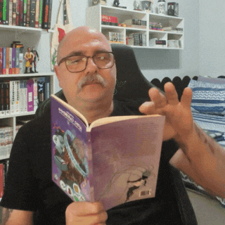 a bald man with glasses and a mustache is reading a purple book with a cartoon character on the cover