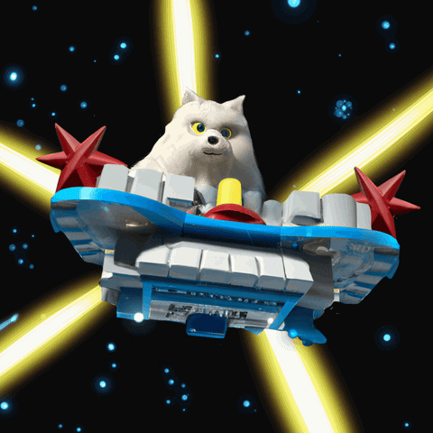Nacho Nachugo, a fluffy white dog, pilots a blue and white spaceship through a starry space.