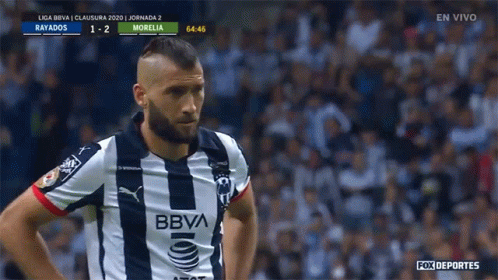 Nicolás Sánchez of Rayados looks upset during a Liga BBVA MX match against Morelia, with his team trailing.