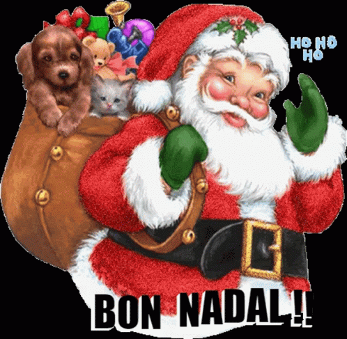 Santa Claus with gifts, wishing 'Merry Christmas!' (Bon Nadal) and 'Ho Ho Ho'.