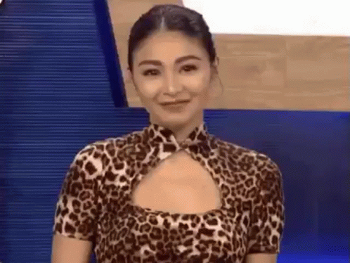Nadine Lustre winks and smiles, making a finger heart gesture in a leopard print top.