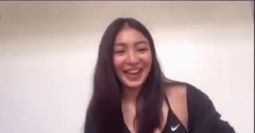 Nadine Lustre joyfully laughing and cheering with arms raised, wearing a black top against a plain background.