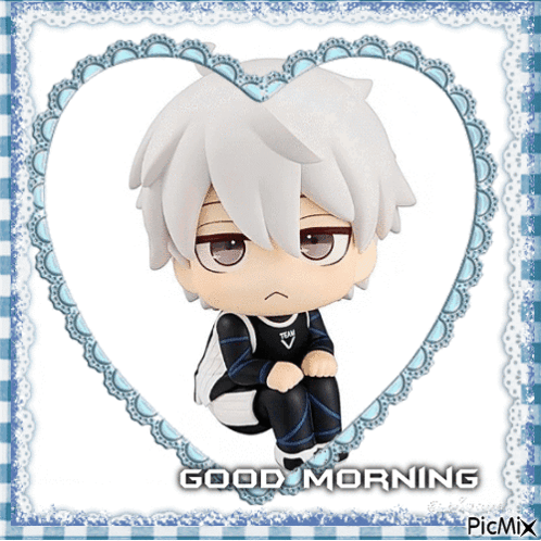 Nagi Seishiro from Blue Lock in a chibi figure, wishing 'Good Morning' within a heart frame.