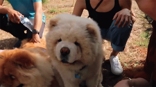 Kimpoy Feliciano's Chow Chows are resting outdoors, one with a blue tag.