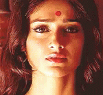 A close-up of actress Ileana D'Cruz with a red bindi, showing a worried or pensive expression.