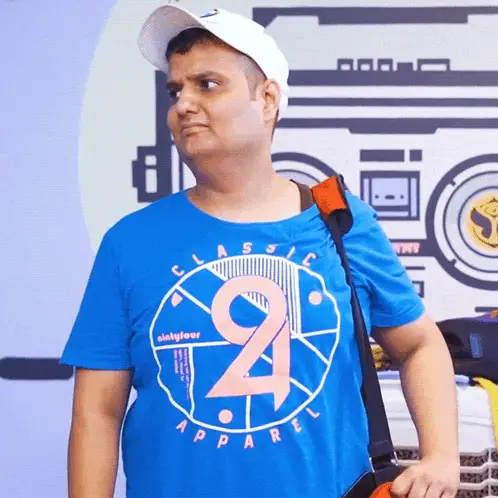Rushindra Sinha, a man with a beard, wearing a light hoodie, with the word 'NAHI' displayed prominently.