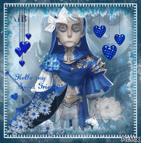 Naib from Identity V with an umbrella, featuring the heartfelt message 'hello my sweet friend'.