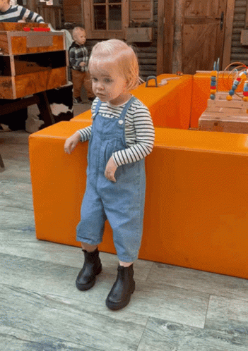 Naja Hannastrijbos, a young child in denim overalls, explores an indoor play area.