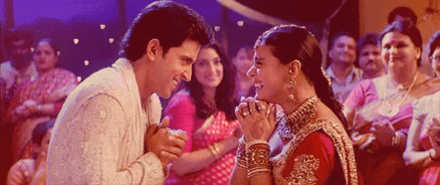 Hrithik Roshan and Preity Zinta share a joyful Namaste moment, smiling at each other during a festive event.
