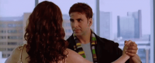 Akshay Kumar and Katrina Kaif share a romantic dance, looking into each other's eyes in a scene from Namaste London.