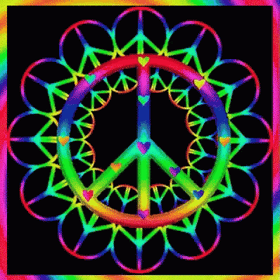 A vibrant, animated peace sign glows with shifting rainbow colors, surrounded by smaller peace symbols and hearts.